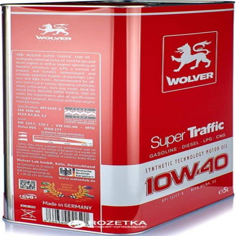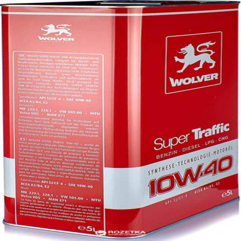 Wolver Super Traffic SAE 10W-40 — всесезонна напівсинтетична моторна олива з універсальними характеристиками. Призначена для бензинових і дизельних двигунів, а також двигунів, що працюють на природному газі (LPG — суміш пропан-бутан або CNG — метан) як атмосферних, так і обладнаних турбонаддувом легкових автомобілів, мікроавтобусів і легких вантажівок. Рекомендована для цілорічного використання в різних режимах експлуатації: міської, заміський цикл, режимах старт-стоп. Ідеально підходить для змішаних автопарків.
