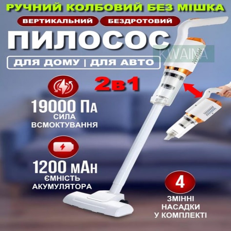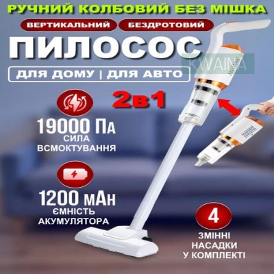 Акумуляторний вертикальний пилосос без мішка 1200mAh 120 Вт бездротовий 2в1 для дому та авто, 4 насадки