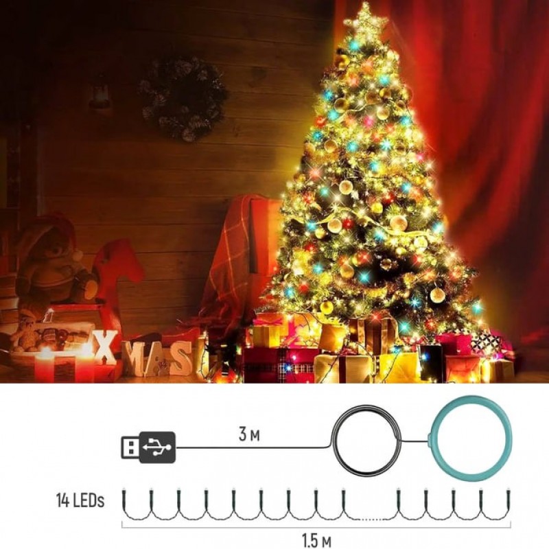Світлодіодна гірлянда «Каскад» створена для того, щоб перетворити вашу ялинку на яскравий святковий шедевр. Гірлянда легко кріпиться на верхівку ялинки, утворюючи 9 вертикальних «променів», що розходяться вниз. Кожен «промінь» має довжину 1,5 метра і прикрашений 14 світлодіодами, які випромінюють різнокольорове світло, додаючи ялинці яскравості та святкової атмосфери. Прозорий кабель майже непомітний, дозволяючи різнокольоровим світлодіодам бути в центрі уваги. Гірлянда має 8 режимів роботи, що дозволяють створити бажану атмосферу для будь-якого свята. Підключення до будь-якого USB-порту забезпечує зручність, автономність та високу енергоефективність. Захист IP44 дозволяє безпечно використовувати гірлянду навіть у вологих приміщеннях, забезпечуючи надійність і довговічність.